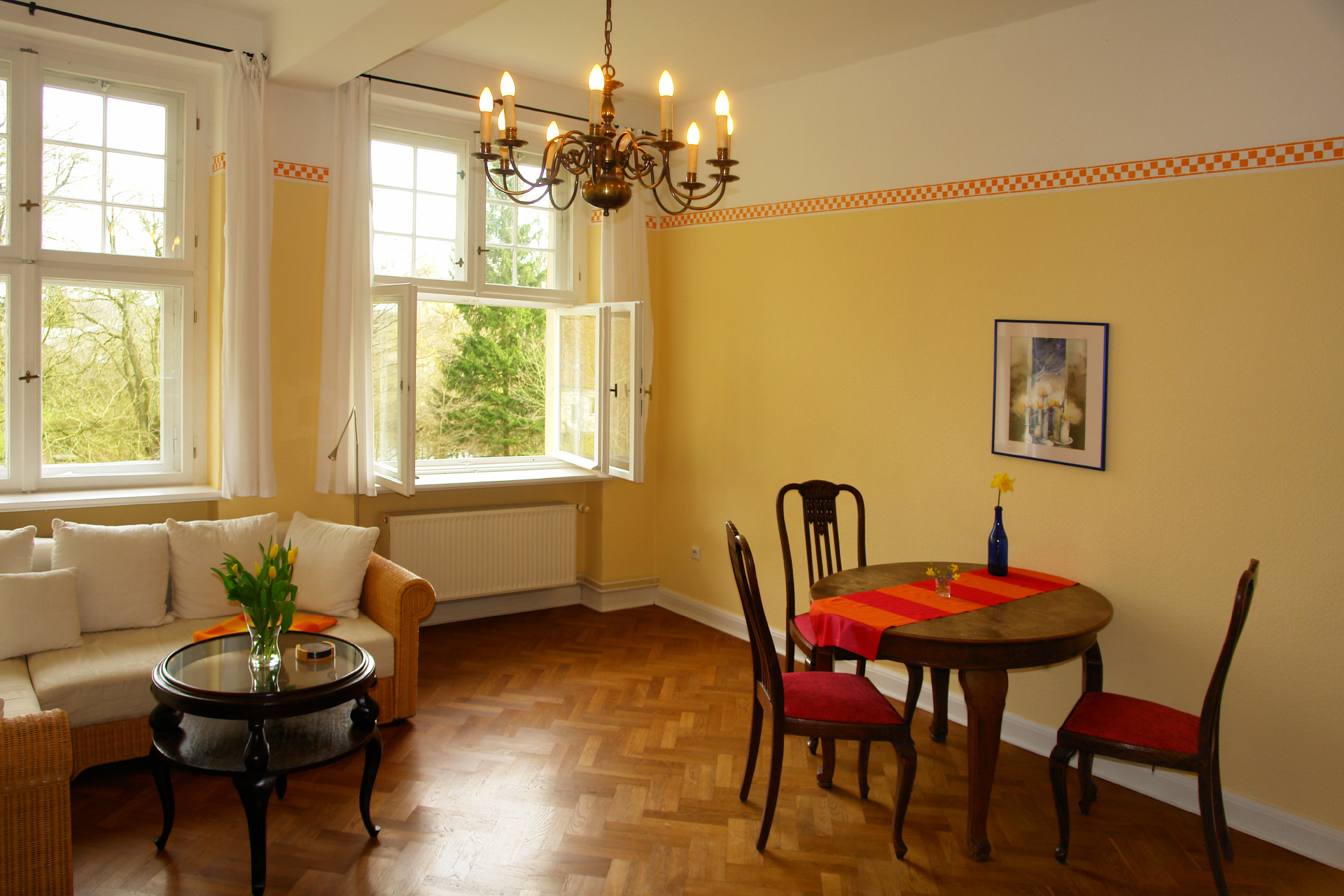 Die Ferienwohnung liegt im Hochparterre, von den großen Fenstern aus hat man einen wunderschönen Ausblick in den Park und auf den Teich.