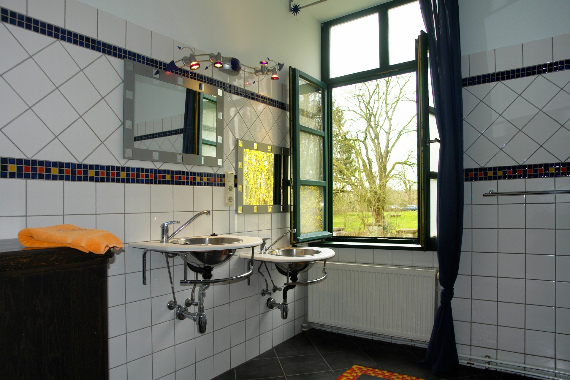 Die Ferienwohnung liegt im ersten Obergeschoss, von den großen Fenstern aus hat man einen wunderschönen Ausblick in den Park und auf den Teich.